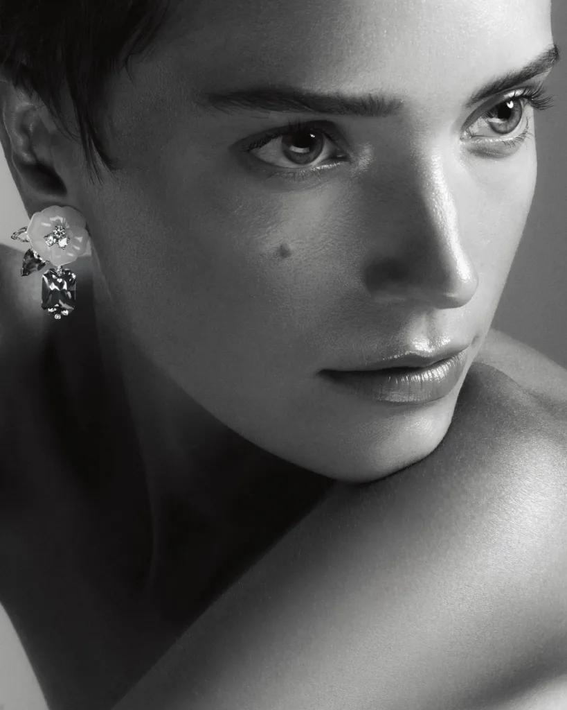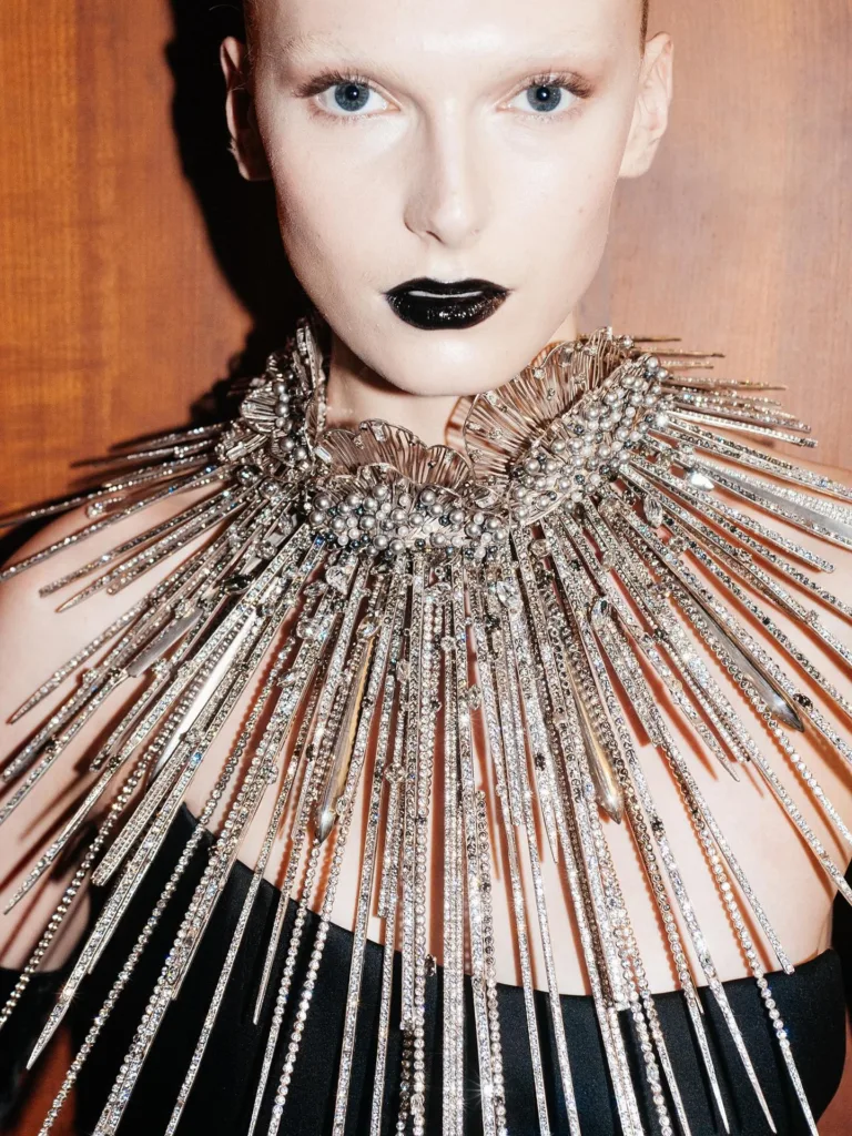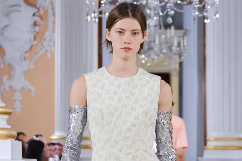 Cool-toned lips emerge as one of the season’s most prominent trends. At Chubova Louina’s London show, lips appeared painted in cool gray tones and outlined with silver stones, transforming the mouth into a work of art. Meanwhile, Simone Rocha presented glossy lips adorned with delicate phrases and flowers, offering a modern take on bold lips.