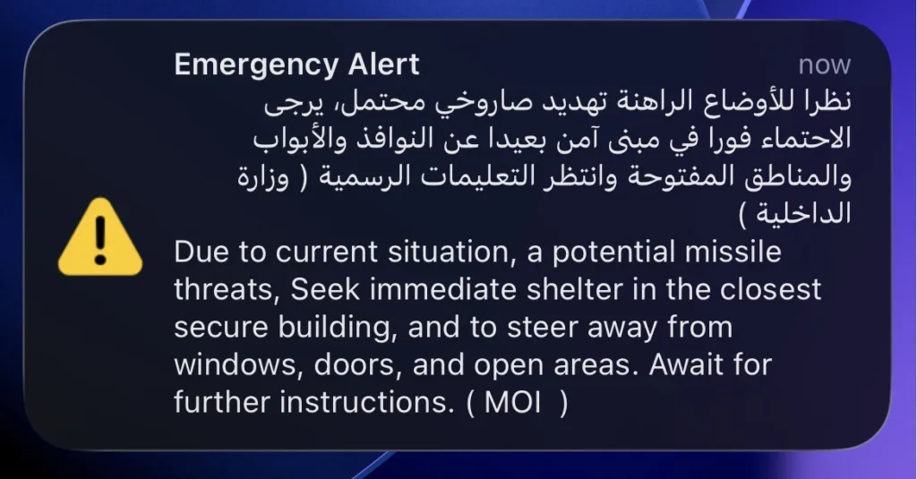 The UAE Ministry of Interior has issued an emergency alert warning residents of a potential missile threat, directing everyone to immediately take shelter in the nearest secure building, move away from windows, doors, and open areas, and await further official instructions.