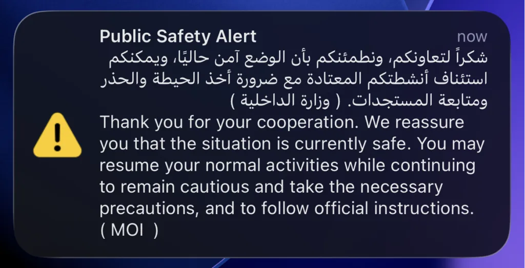 The UAE Ministry of Interior has issued a public safety alert confirming that the situation is currently safe.
