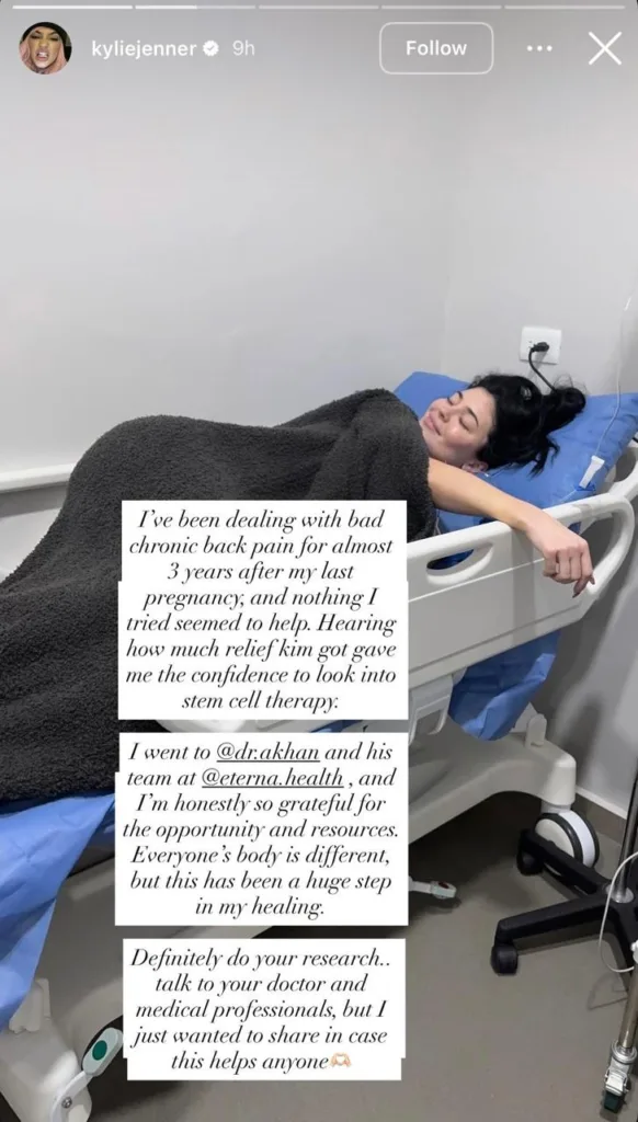 “I’ve been dealing with bad chronic back pain for almost three years after my last pregnancy, and nothing I tried seemed to help. Hearing how much relief others got gave me the confidence to look into stem cell therapy ,” Jenner wrote.